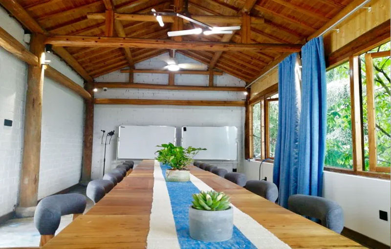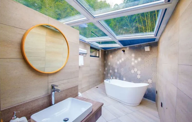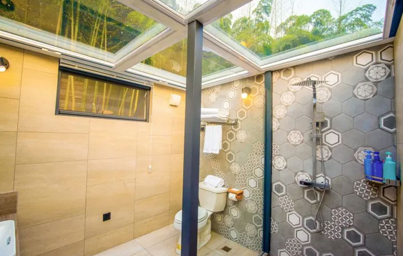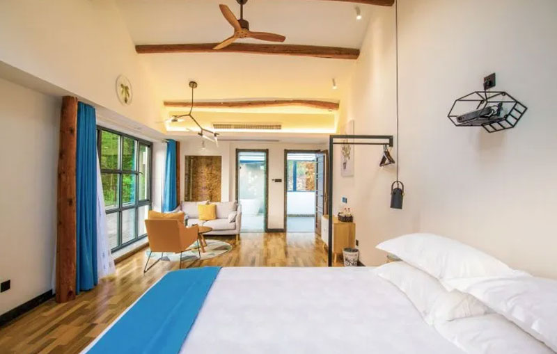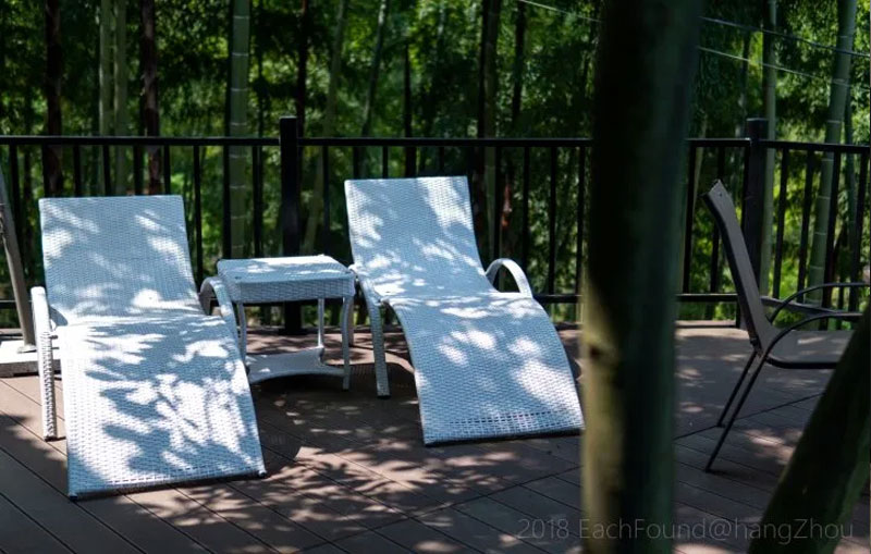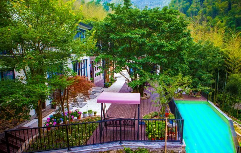 正值六月,就想脱了鞋子到溪水里玩耍,管家早已在门口等,让先去上面休息一下。民宿的一楼院子里,有几株大大的芭蕉树,很是养眼。无边游泳池的水整排如珍珠垂落,形成一幕水墙,凉快之气迎面而来。